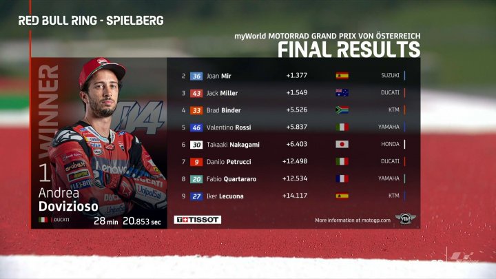 Unos días después de anunciar su separación, Andrea Divizioso y Ducati conquistaron el GP de Austria de MotoGP, marcado por un espeluznante accidente en el que Valentino Rossi salvó la vida de milagro y un carrerón de Joan Mir, quien llevó a Suzuki al segundo lugar del podio.