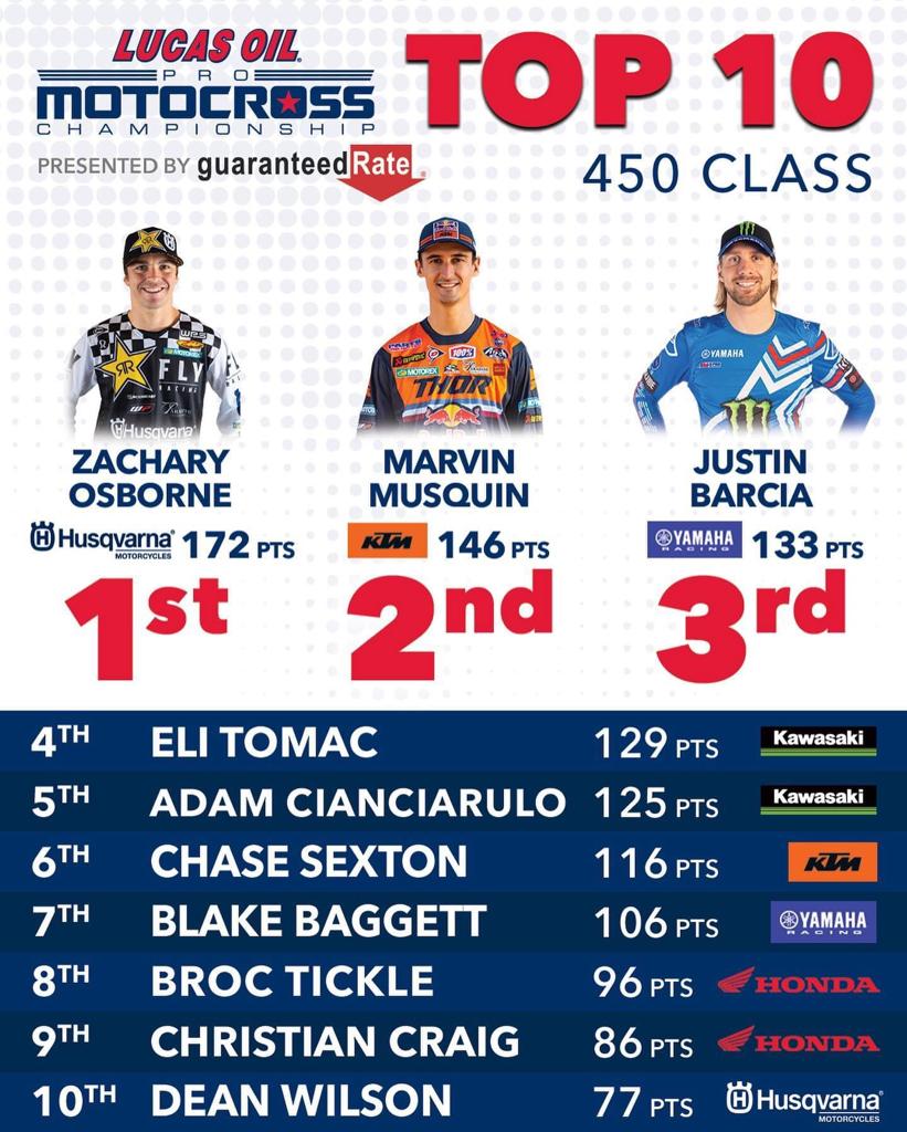 El encuentro, en la categoría 450 fue dominado el actual líder de esta clase, el piloto del Rockstar Energy Husqvarna Factory Racing, Zach Osborne, quien dominó las dos mangas de esta cita. Su mejor resultado en carrera en lo que va de la temporada.