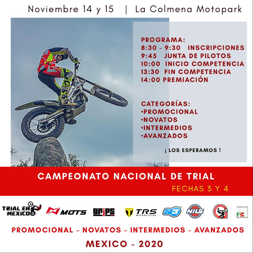 El Campeonato Nacional de Trial se reanudará el fin de semana del 15 y 15 de noviembre, con las fechas 3 y 4 del calendario 2020, en La Colmena Motopark, en el Estado de México.