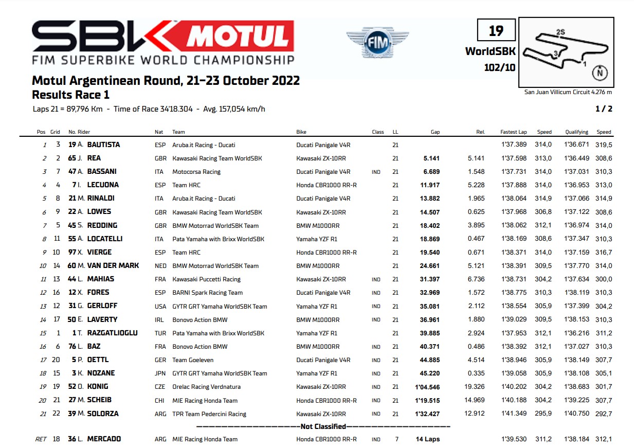 De esta manera, Bautista cierra la primera jornada de carreras en Argentina con 80 puntos de ventaja sobre Razgatlioglu al frente del campeonato y 87 respecto a Jonathan Rea con 161 puntos aún en juego. Si conserva una ventaja similar tras las carreras de mañana, llegará con firmes opciones de coronarse en tres semanas en Indonesia.