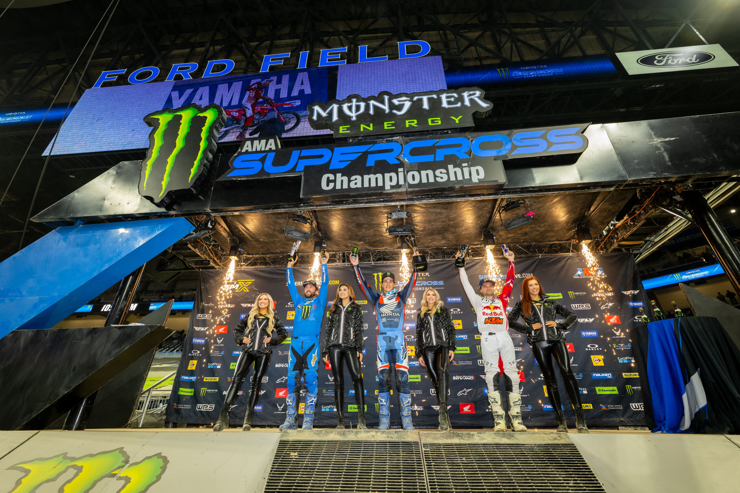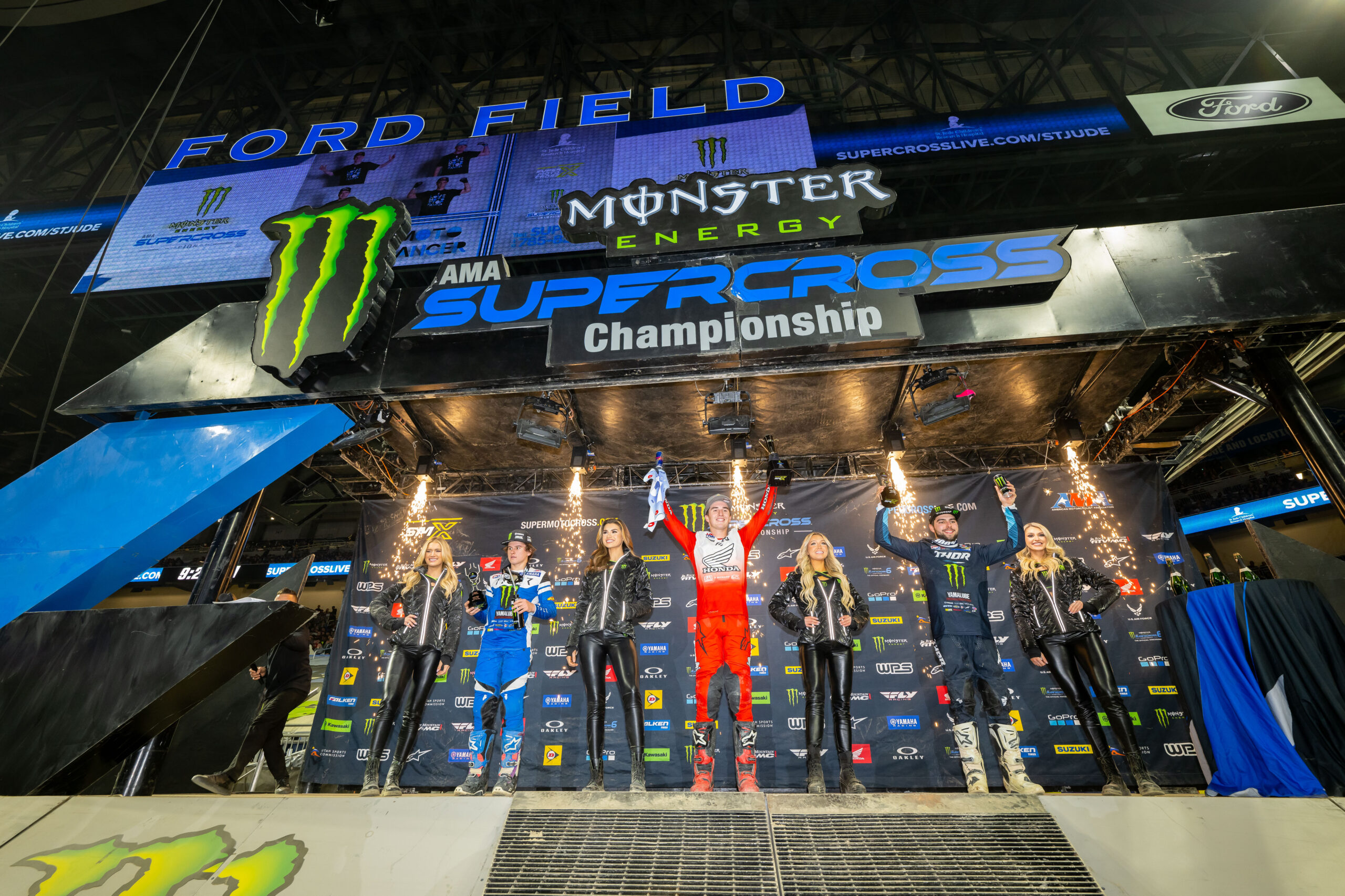 Cooper Webb de Red Bull KTM se llevó el segundo lugar y Eli Tomac de Yamaha Star Racing consiguió el tercer puesto, sumando puntos para el Campeonato Mundial inaugural de SuperMotocross.