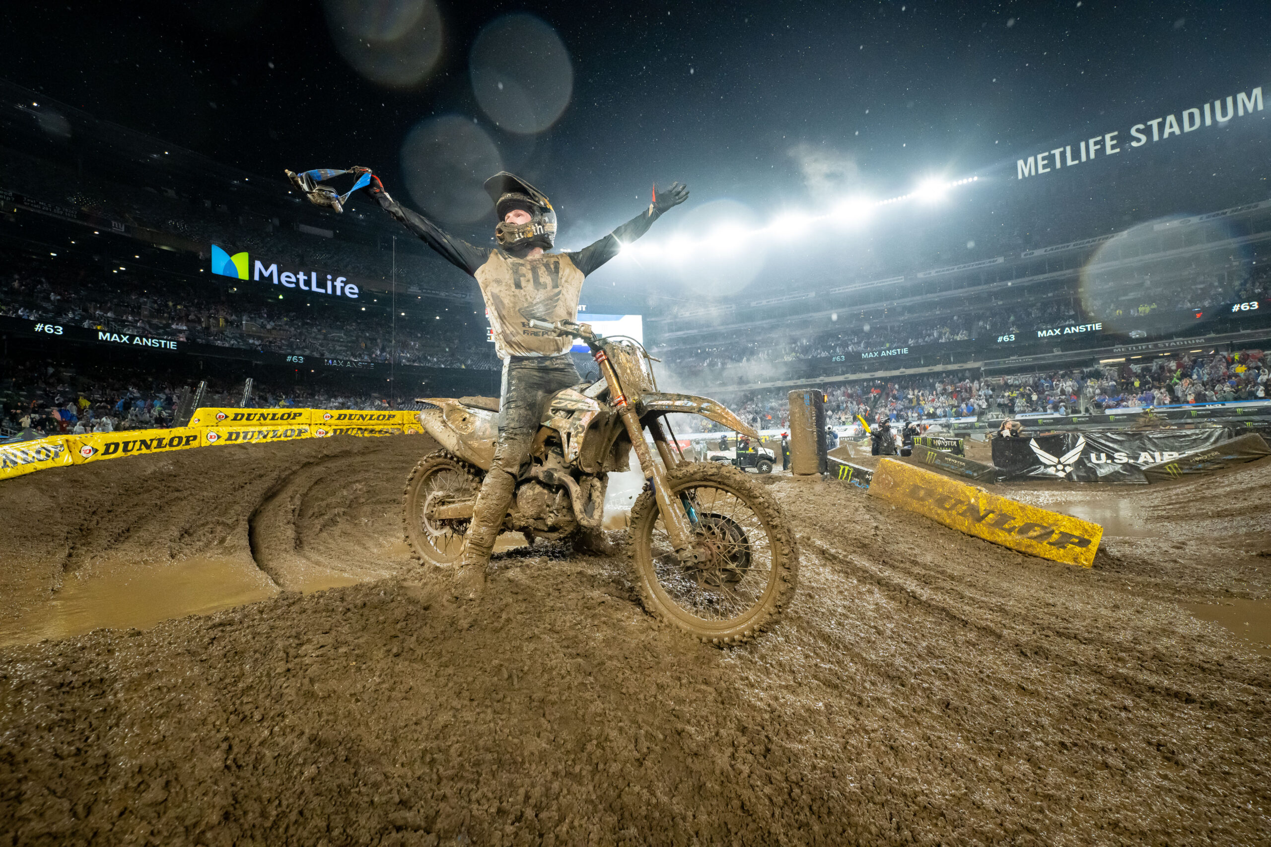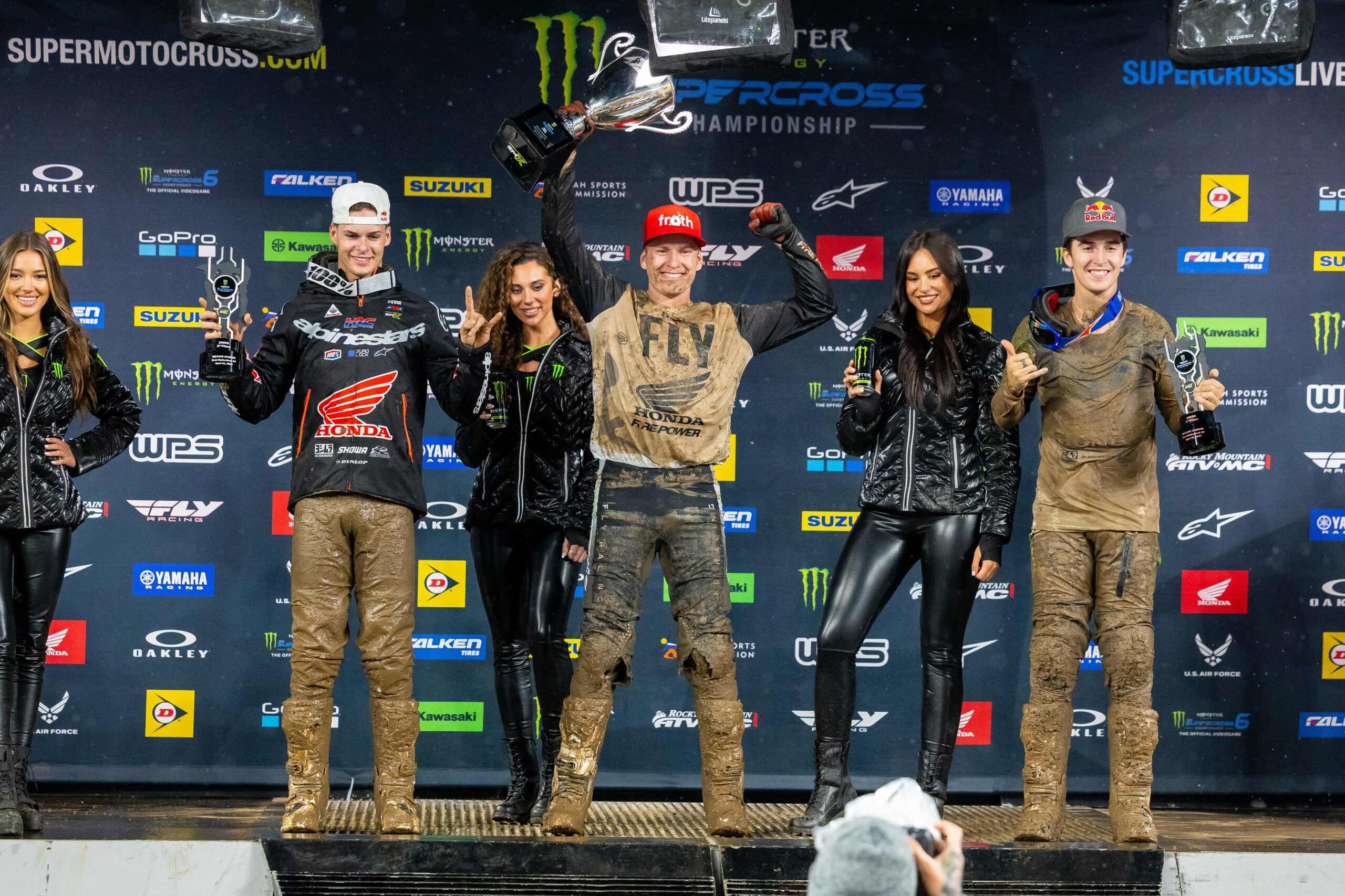Al final, Anstie obtuvo su primera victoria en Supercross, Jett Lawrence se puso en marcha a tiempo para mantener el segundo lugar y Hunter Lawrence cruzó justo detrás de su hermano en tercer lugar.