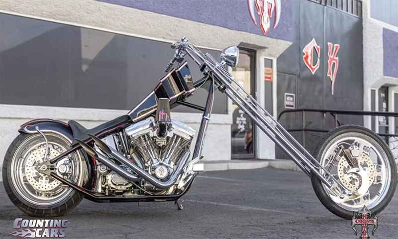 Creada en 2005 por Counts Kustoms, el taller de Las Vegas famoso por sus personalizaciones extremas, esta moto no fue un simple capricho de celebridad, sino una verdadera declaración estética. Montada sobre un bastidor LS300 rígido y equipada con una horquilla Springer de Sugar Bear, presenta un diseño agresivo de inspiración sueca con neumático trasero de 260 mm que remite directamente al espíritu americano.