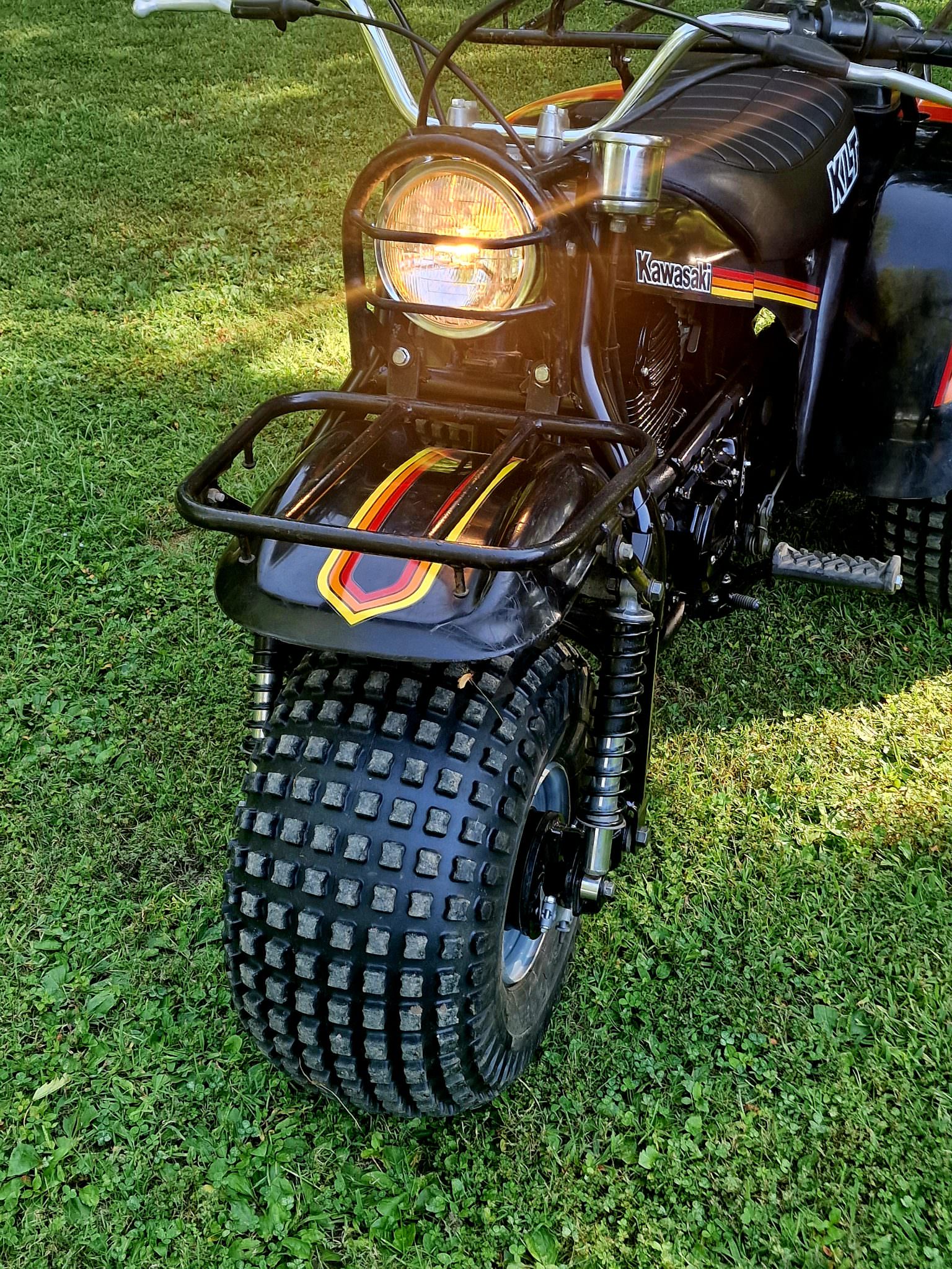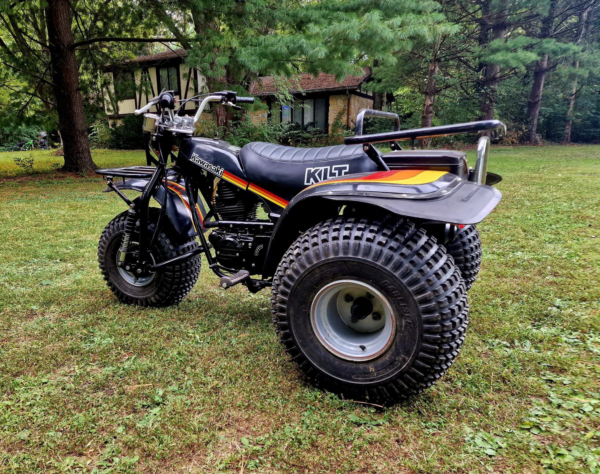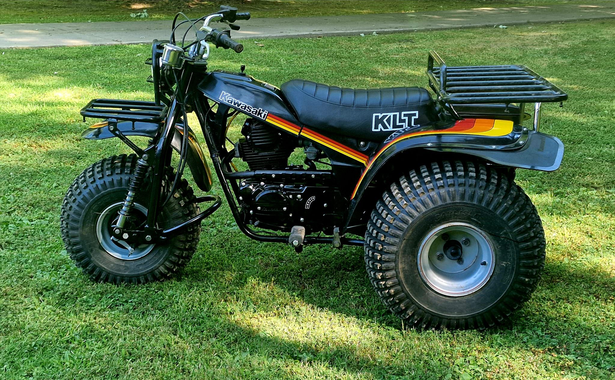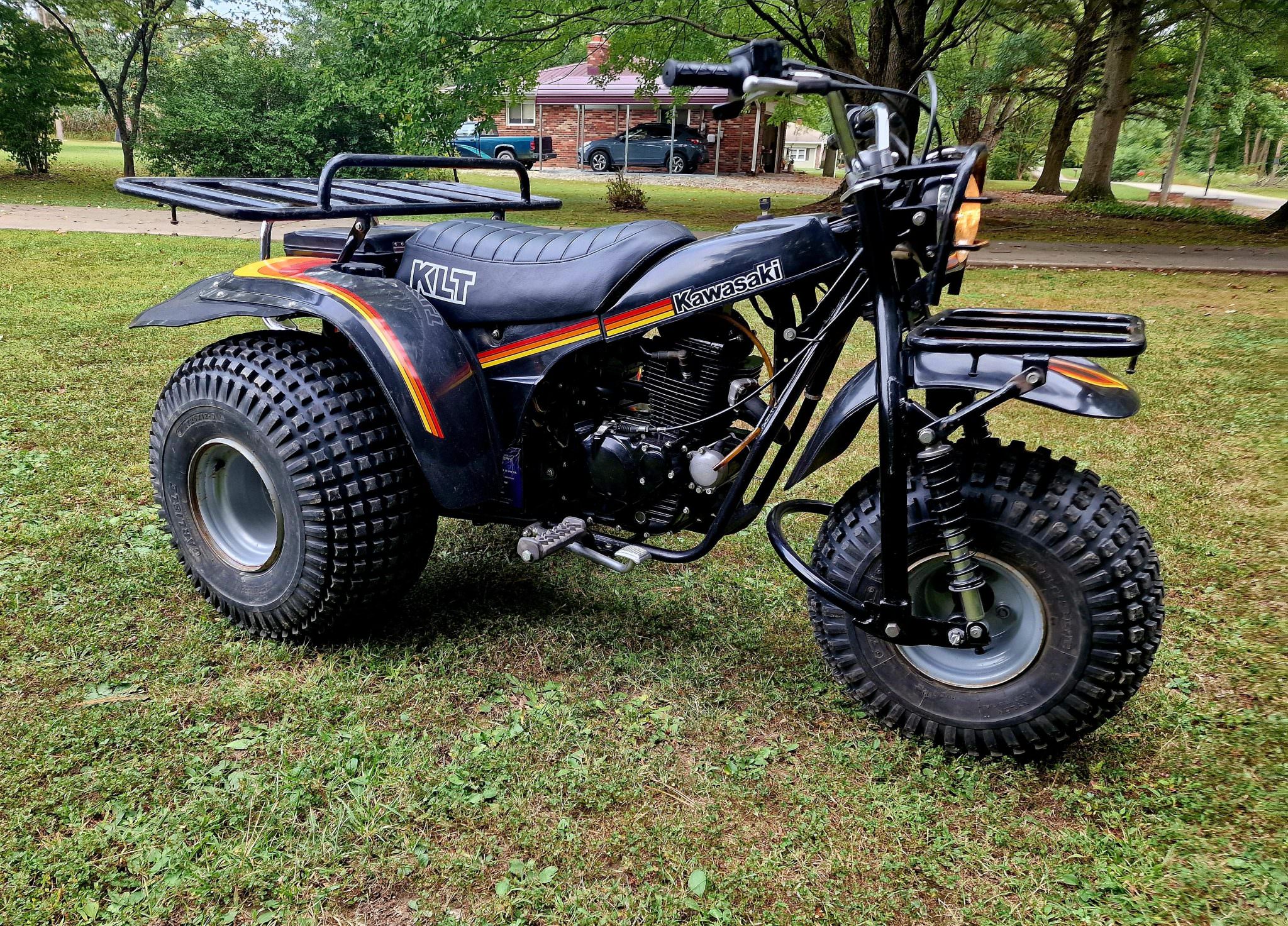 This is an original Kawasaki KLT250 Prairie, a three-wheeler that debuted in the early 1980s as a more serious, agricultural vehicle rather than the far more common leisure-oriented ATVs of the time.