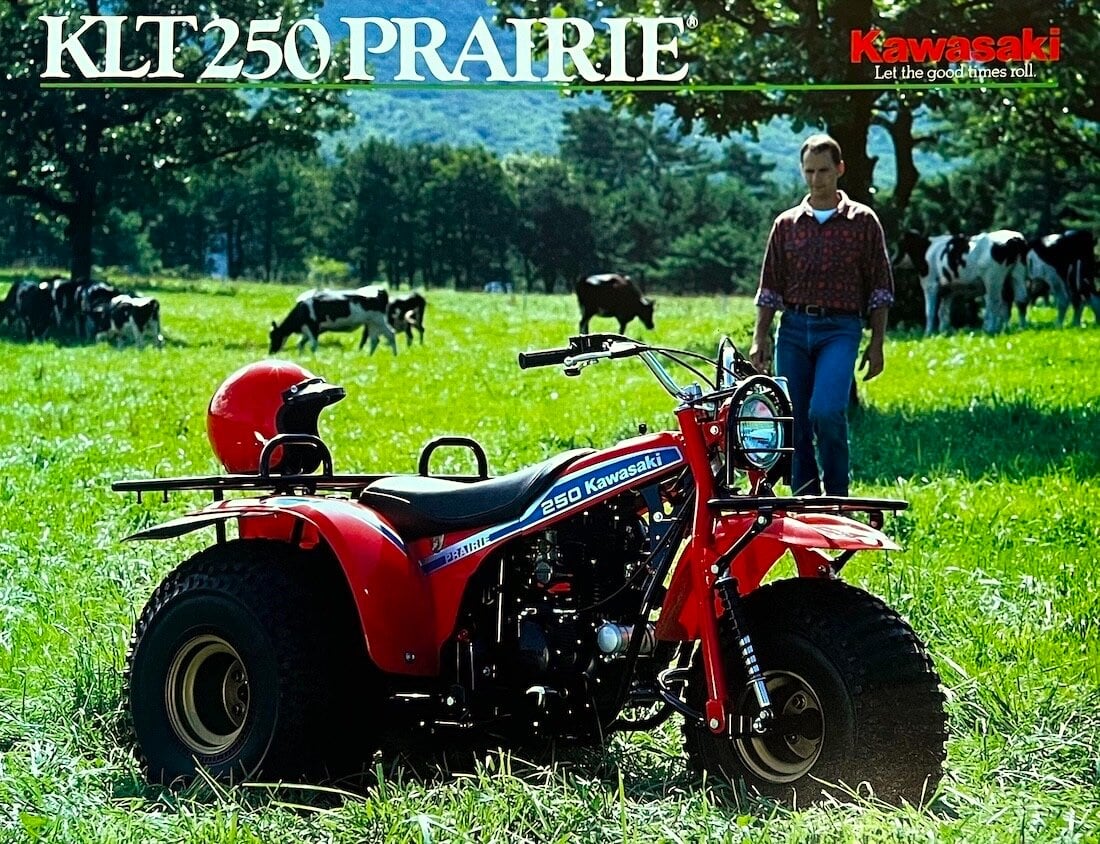 The Kawasaki KLT250 Prairie arrived in the early 1980s as part of the wave of utility-oriented three-wheelers that followed the more leisure-oriented ATCs of the late 1970s. Kawasaki had entered the ATV market with smaller displacement machines, and the KLT250 was their first serious effort at an adult-sized, four-stroke utility trike. Image courtesy of Kawasaki.