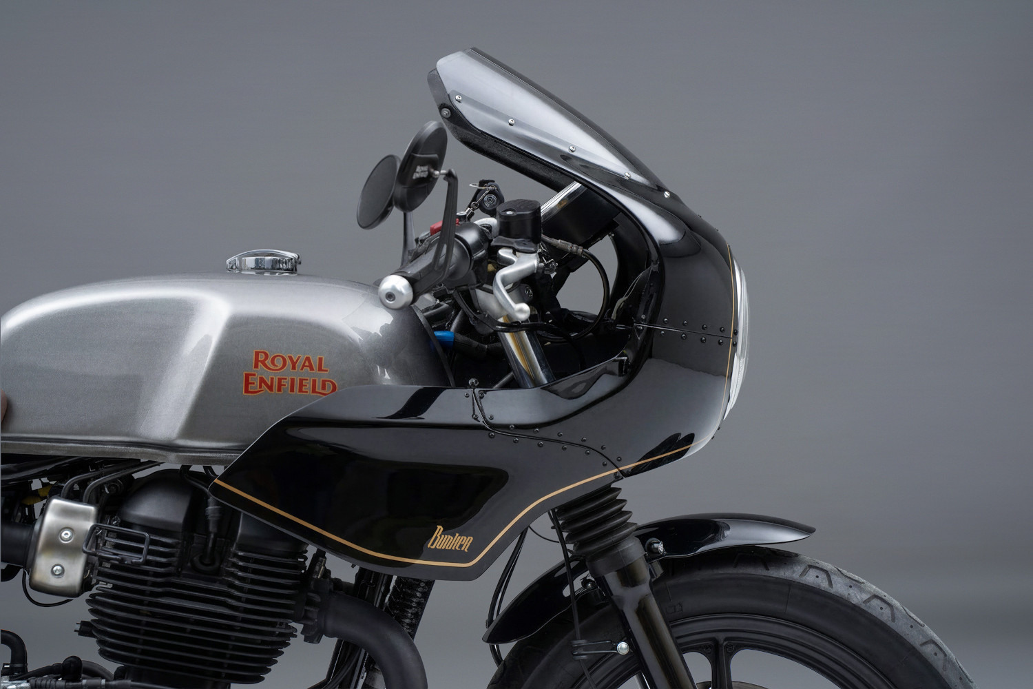 Reducir las influencias de los café racers de los años 60 a 80 en un solo paquete cohesivo no es una tarea pequeña, sin embargo, el arma principal de Bunker fue un impresionante nuevo carenado frontal. Buscando incorporar detalles de grado aeronáutico, construyeron un ensamblaje de múltiples piezas a partir de seis paneles de plástico reforzado con fibra de vidrio. Estos se unen mediante una serie de tornillos de acero inoxidable M3 negros, dando al carenado una vibra aeronáutica remachada. Para montarlo adecuadamente, los hermanos tuvieron que modificar la parte delantera del marco de acero tubular, montando una estructura de soporte de acero de 2 mm directamente en la cabeza de dirección.