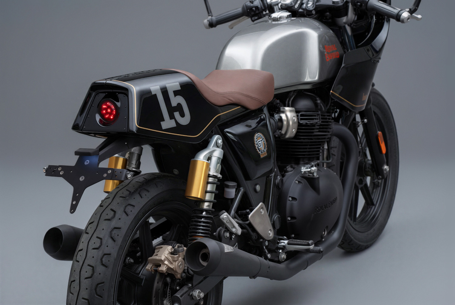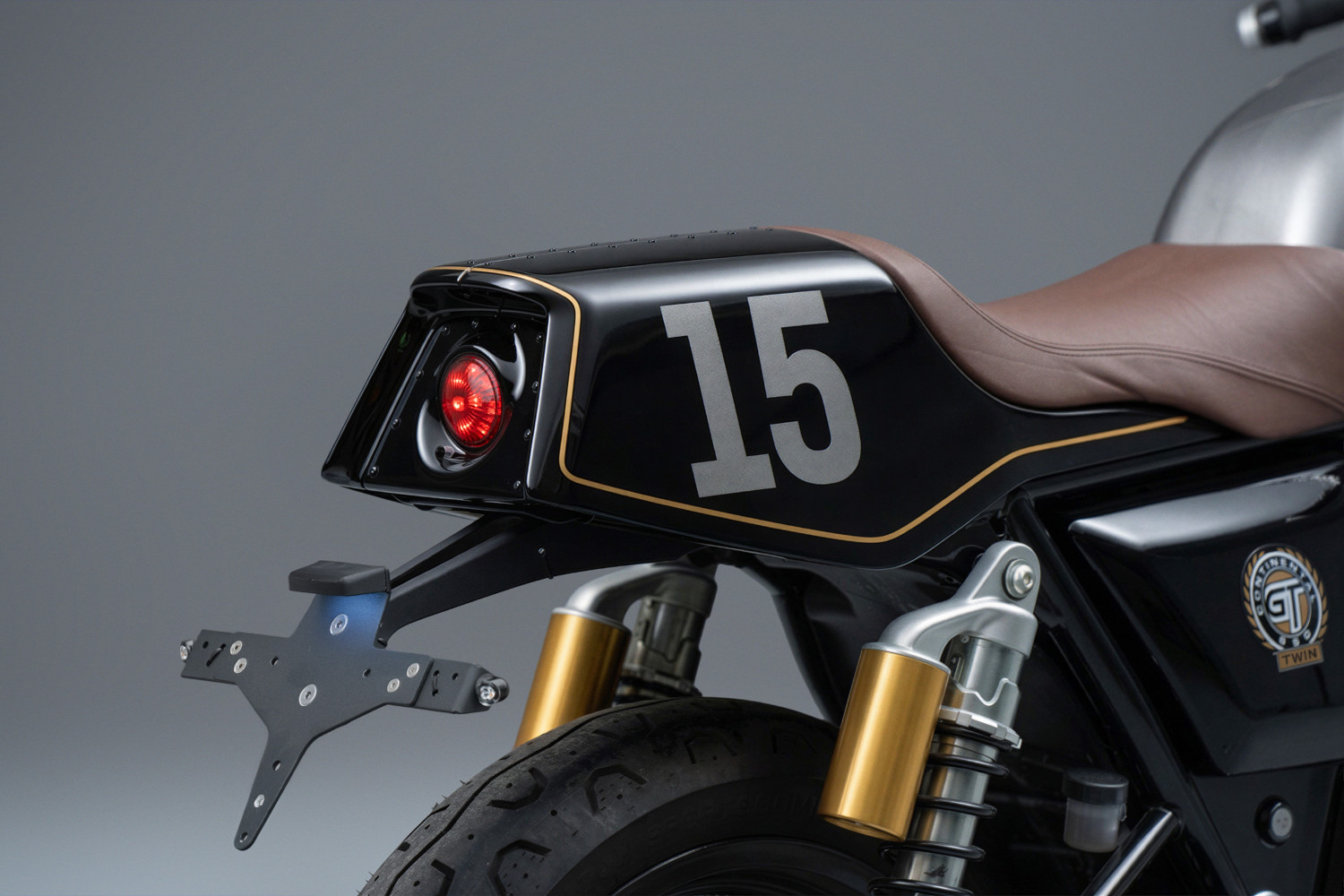 La nueva sección trasera, también hecha de plástico reforzado con fibra de vidrio, alberga un ordenado freno LED integrado. Pintado de lado está el número de la suerte del propietario, 15. Es un toque personal en una moto que fue en gran parte dejada a la libertad creativa de Bunker. «Él nos dio la dirección inicial, luego nos dio la libertad para llevar el diseño adelante y tomar las decisiones finales», señalan.