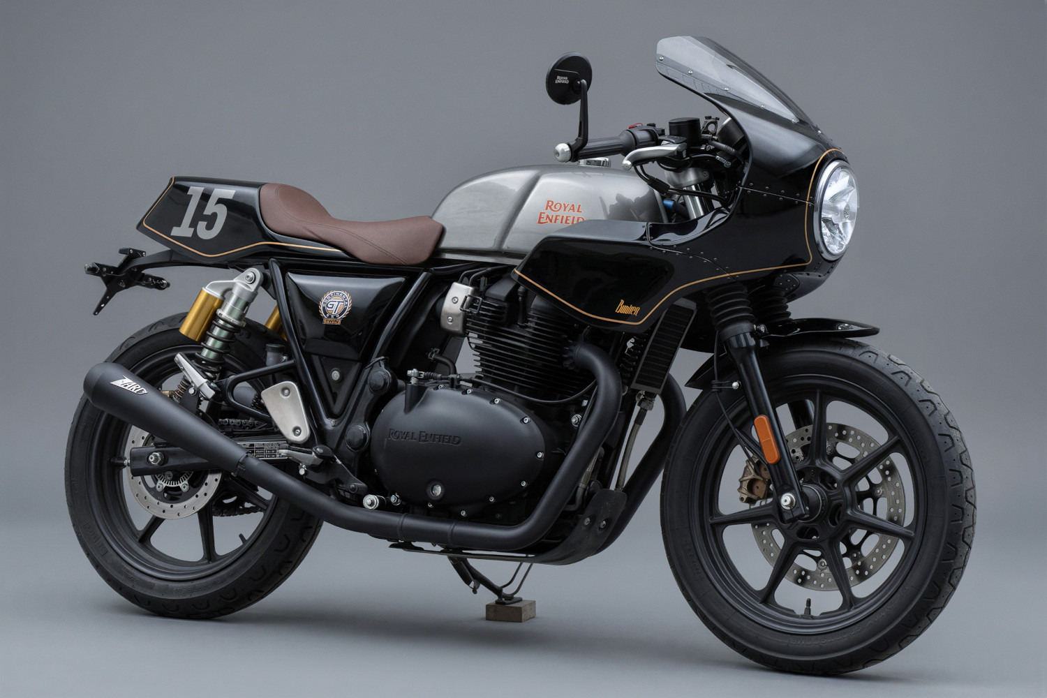 La banda sonora es proporcionada por un par de escapes Zard. Curiosamente, estos silenciadores fueron diseñados originalmente para un Royal Enfield de un solo cilindro de 350 cc. Bunker los modificó en un sistema simétrico para el 650, descubriendo que el tono ligeramente metálico de las unidades Zard se adaptaba perfectamente al carácter del bicilíndrico en paralelo una vez que fueron abiertos.