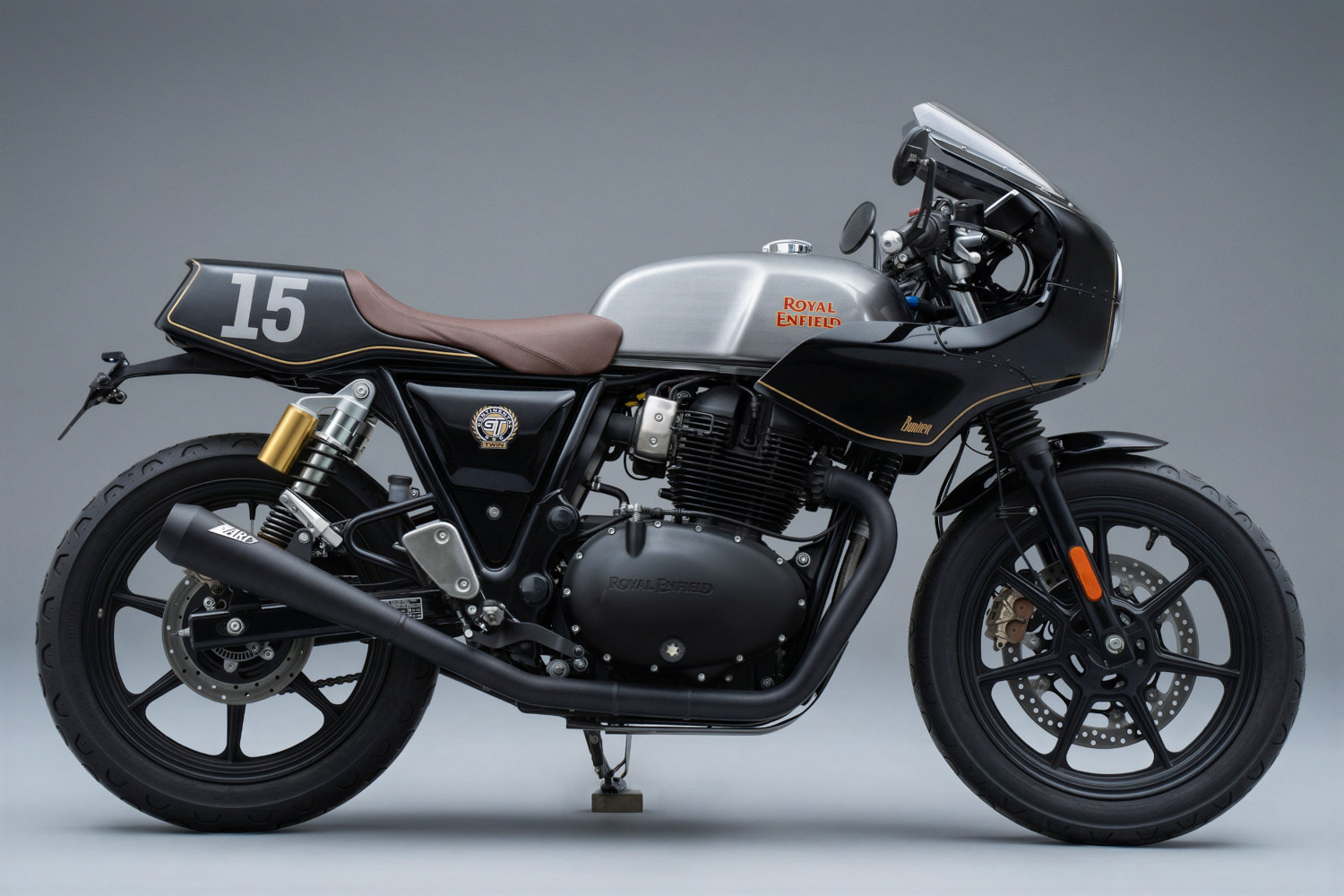 El acabado es donde la construcción toma un curioso giro multicolor. El tanque de gasolina permanece en un clásico plateado, adornado con el emblema rojo y amarillo de Royal Enfield. Por el contrario, el nuevo carenado y la sección trasera están terminados en un negro profundo, resaltado por un pinstripe dorado que sigue las nuevas curvas. El asiento está envuelto en cuero marrón, una elección polarizadora para muchos lectores de Bike EXIF.
